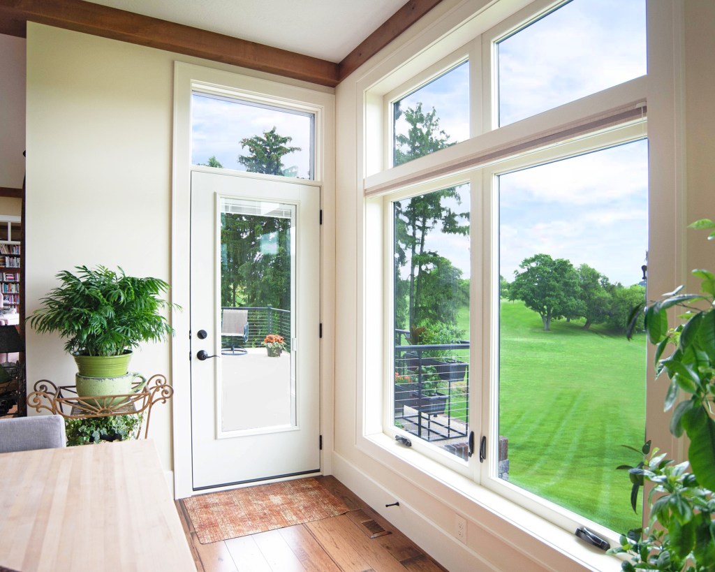 1. Clean, simple design. Casement windows — hinged on the side, swing outward to opening — are a good choice for smaller-scale homes or hard-to-reach areas, and their crank-style openers make them easy to operate, especially for homeowners with physical challenges.