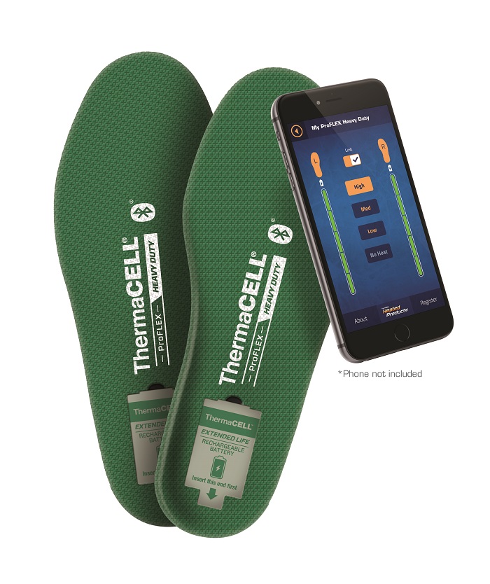 Thermacell released its new ProFLEX Heavy Duty heated insoles with Bluetooth technology. Users control how warm they want their insoles to be via an app on their smartphone that connects to the insoles using Bluetooth. Each insole has a removable, rechargeable battery. According to the company, each battery fully recharges in two hours or less and will last up to 8.5 hours on one charge. The ProFLEX Heavy Duty have been tested to 1 million steps. $199