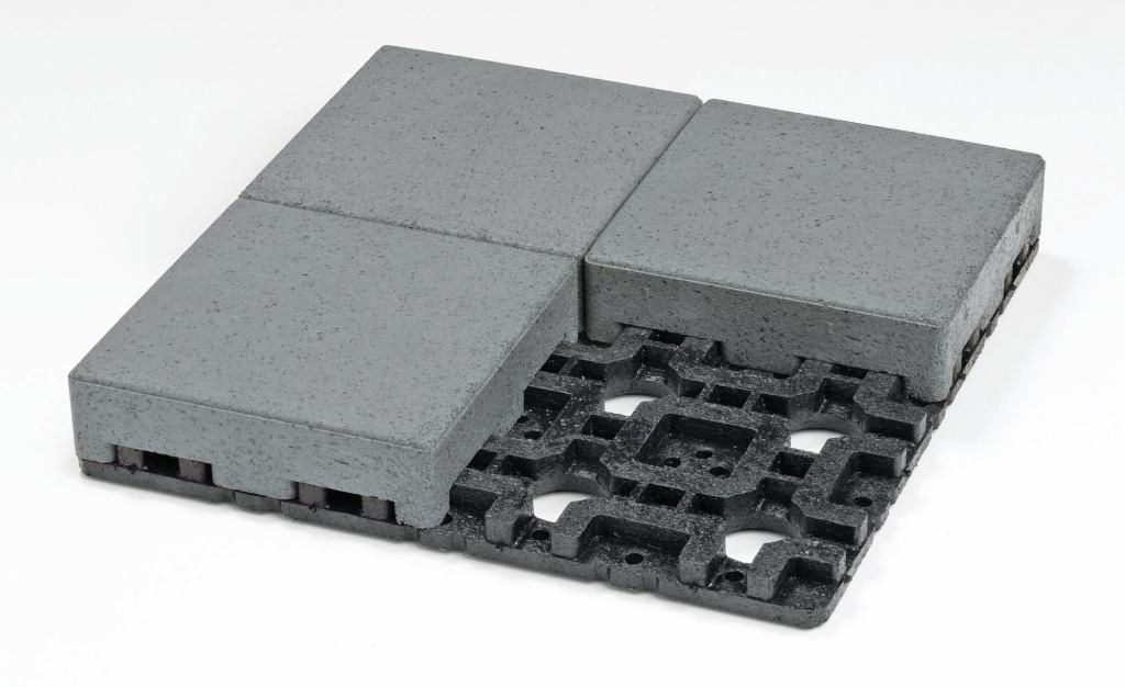 An 8-inch by 8-inch standard paver (shown) and two resurfacing pavers—one with a bullnose edge and one with a sloped transition edge—are the latest additions to Azek’s composite-paver line.