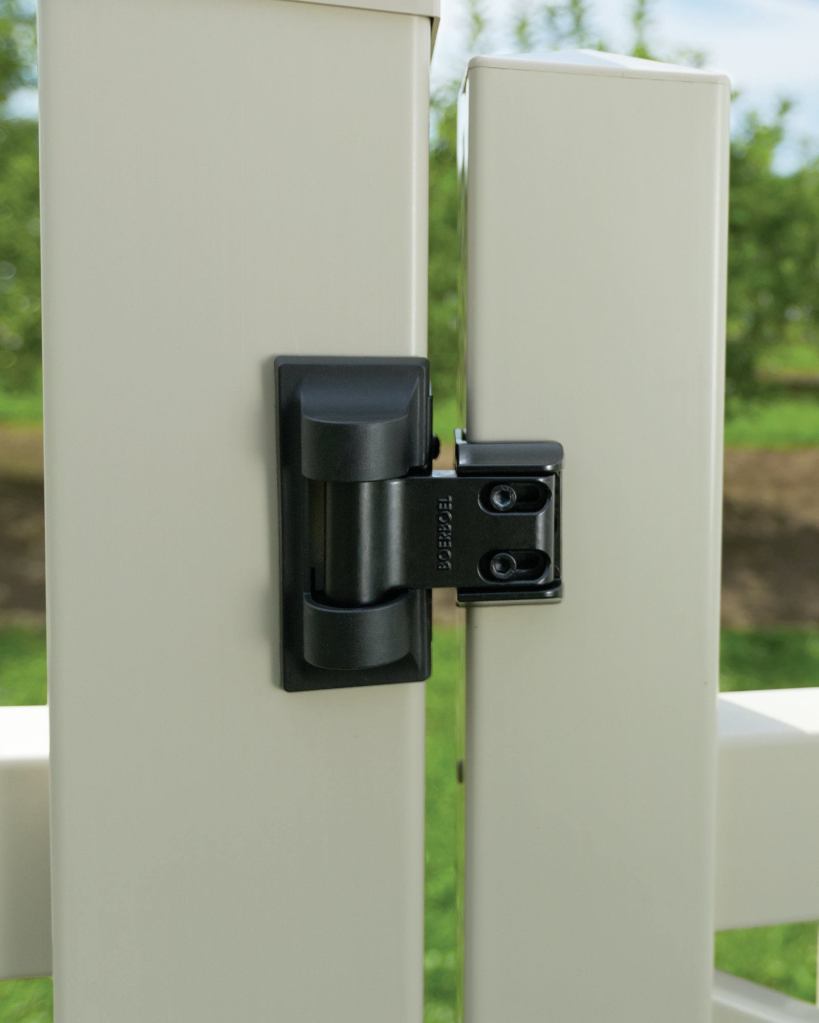 Boerboel’s wrap hinges will support a gate of up to 75 pounds or 72 inches wide and withstand a point load of 1,500 pounds. A tension control can be set for self-closing or manual operation. Designed for use with a 2-inch-square or larger post and a 1 1/2-inch or larger gate upright in vinyl, aluminum, or wood, hinges are manufactured from zinc-plated powder-coated steel or stainless steel in one color—black. The company says hinges go through testing equivalent to 10 years of use, plus ASTM B117 salt-water testing. A kit with two hinges, a handle, and a latch sells for about $50. Boerboel, 800.336.2383, boerboelgatesystems.com