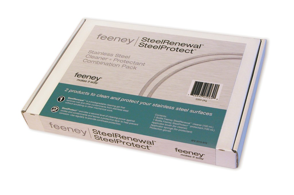 Stainless steel cable railing looking a little dingy? Feeney now sells a combination maintenance kit consisting of SteelRenewal for removing stains and corrosion, and SteelProtect for protecting the surface. Marketing VP Andy Penny says that while stainless steel is durable, it can still show stains and suffer corrosion, especially in coastal regions or where airborne contaminants are common. SteelRenewal is a biodegradable gel that cleans the surface without scrubbing. A kit contains one 100-ml bottle each of the cleaner and the surface protector, as well as a brush, a sponge, and a pair of gloves. It retails for $35. Feeney, feeneyinc.com