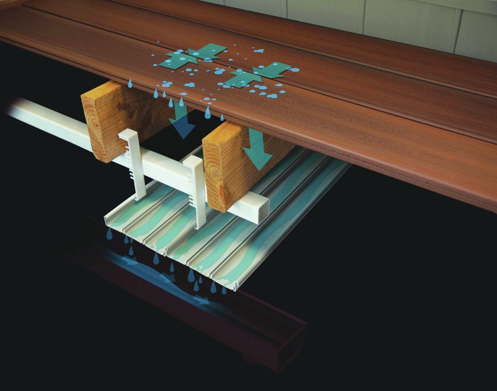CertainTeed’s UnderShield water-diversion system is designed to keep below-deck spaces dry. Vinyl panels measuring 16 feet long by 6 inches wide attach to a concealed grid that’s attached in turn to the deck framing. The panels, which divert water to the edge of the deck, are available in chamfer or beaded styles and in three colors: white, gray, and wicker.