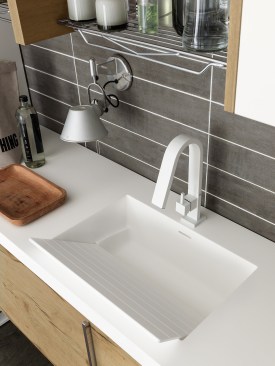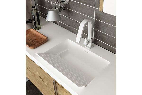 Hastings Tile & Bath’s Urban Wash collection for laundry rooms includes integrated or drop-in ceramic or solid-surface sinks with removable washboards. Five integrated options and four drop-in options with varying sizes and styles are available; pricing ranges from about $900 to $1,200 for ceramic and $1,300 to $1,500 for solid surface. hastingstilebath.com