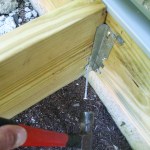 While toenails may provide the required uplift and lateral resistance, many inspectors are looking for a more reliable connection, like hurricane ties (Figure 13), to connect joists to the beam. They are inexpensive and ward off any questions. I toenail each joist to the layout line and return later to mount the hurricane clips. By alternating them on either side of the beam from joist to joist, there’s less chance of driving the beam out of alignment with the posts below. On an elevated deck where I’m going to be installing the footings and post bases after building the frame, the hardware pieces hang the beam and posts during the process.
