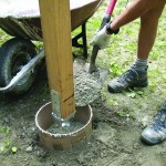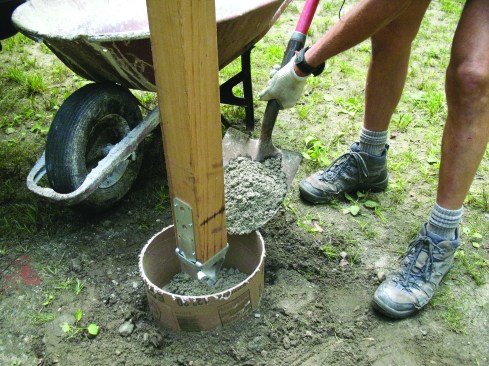 The type of post-base I choose depends on the deck configuration. Elevated decks allow for the option of temporarily supporting the deck frame and installing footings and posts later. I like to use cast-in-place post bases on these decks (Figure 8). First I dig the footing holes, cut the posts, and fasten a base to each post; then I hang the post from the beam over the footing; and last I pour the concrete.