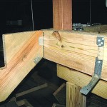In 2009, hardware makers introduced specially designed connectors that are faster to install and less costly than previous models and seismic hardware used for the purpose (Figure 15). The new hardware requires only a single bolt through the post and mounts to the joist with structural screws rather than additional bolts. The screws zip in fast with impact drivers and don’t require the extra step of pilot holes.