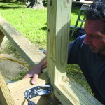 Hardware choices for post-to-beam connections probably outnumber those for any other deck framing connection. My preferred post-to-beam connection, though, doesn’t rely on hardware at all. I like to notch 6×6 posts with beam seats, leaving a 21⁄4-inch leg that extends up to the top of the beam, then through-bolt the beam to the legs (Figure 10). The legs not only provide lateral and uplift load resistance, they also secure the beam from rotating — something common hardware doesn’t do. When working with 4×4 posts, I bolt or screw a length of 2-by that spans from the top of the beam down the back of the 4×4 about 2 feet (Figure 11).