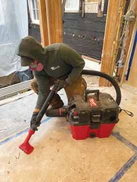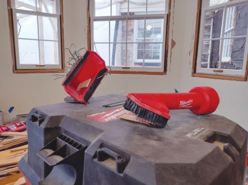Dust collection. The large, 2 1/2-inch-diameter hose performed well without clogging in post-demo cleanup, and the Air-Tip dust collector attachment was a favorite among our team. This attachment uses the suction created by the vacuum to stick to a wall underneath the work area where dust is being created. Whether used for dust collection for cutting plaster with a multi-tool or drilling pilot holes for handrail brackets, this attachment has proven to be valuable in keeping finished interiors clean.
