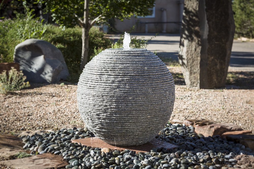 Stone Forest Ribbed Sphere Fountain is carved from a single block of granite.