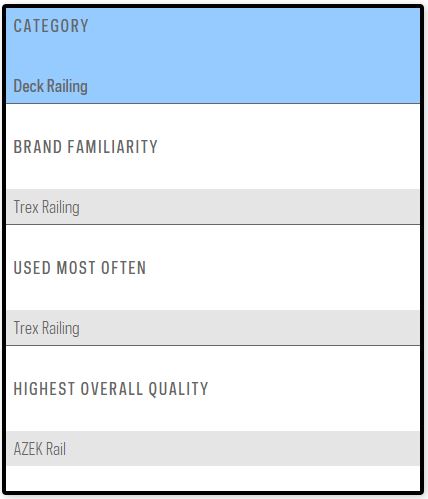 Most remodelers, like consumers, tend to lean on specific product brands. Every two years, REMODELING surveys its readers about the brands they know, the brands they use, and brands they perceive to be the best in several major product categories, including decking and railings. The majority of readers who responded to the survey, 83%, work exclusively on existing housing—43% of that work on structural alterations and additions, 35% on major replacements, and 22% on maintenance and repair work. About 73% of firms reporting took in under $1 million in revenue while 15% took in between $1 million and $3 million, and 12% earned over $3 million (of which only 2% earned over $10 million).
