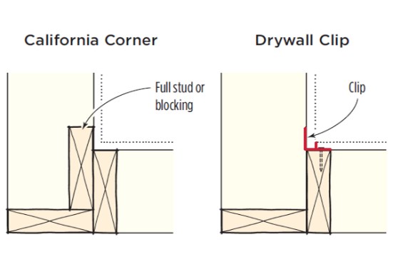 That difference showed up almost immediately in the framing details. One example was the use of a three stud California corner. Our standard is a two stud corner using drywall clips, which eliminates unnecessary wood and reduces thermal bridging. (For a comparison of the two methods, see he illustration below.) The cost difference of a single stud is minimal, but the performance impact is not. Fewer studs mean more room for insulation and better thermal performance at the corners, which are some of the most vulnerable areas in the building envelope.