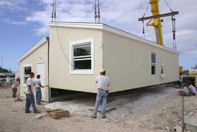 Coast Guard prefabricated concrete barracks under construction on the island of Inagua in the Bahamas. The 2000-square-feet units have four bedrooms each, plus a common area. They were built as half-modules at the Florida manufacturing facility of Royal Concrete Concepts, shipped to the island on barges, and set in a few hours using cranes. It’s a quick and economical method for the military’s remote construction needs. However, the concept also works for more complex civilian homes. And it offers consistent speed and quality control for institutional buildings such as schools, or for commercial construction. If you want to learn more, there’s an extensive gallery of photos showing the plant’s tilt-up methods for making modular units, as well as field construction techniques, at the Royal Concrete Concepts website