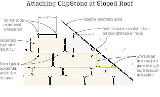 When ClipStone is installed along a sloped roofline (or interior ceiling), the likelihood of needing to cut off part of the top mounting clip increases for shorter pieces and on shallower roofs. For a cut piece, we recommend at least one eyelet of the top mounting clip and both bottom legs be left in place. To ensure this, we advise starting a new course at the cut piece, rather than installing full-size pieces and working from the center of the wall out toward the roof slope; this way you can make sure the cut piece fits tight and can be secured with at least one screw.