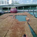 Workers assemble a floating island on a waterway in Singapore.