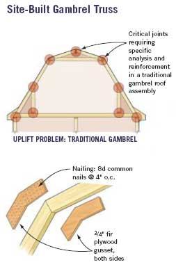 In the previous issue, I compared the traditional way of framing a gambrel — two rafter systems joined by a horizontal nailer at midroof — with a more modern method that employs gusset joints at the mid-rafter span. I examined one aspect of this roof structure: the way it handles gravity loads. As a result of new hurricane-related codes that have come into force along the East Coast, however, builders now have to determine wind loads too, which can complicate the roof design issue considerably.