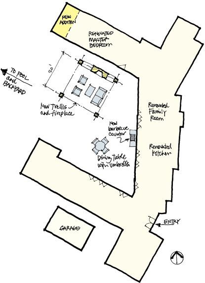 A plan view of the trellis project shows the relationship between the outdoor space and the renovated interior rooms. The small addition at upper left contains an indoor bathroom for the master suite and a smaller outdoor bathroom that’s conveniently near the pool and sitting area.
