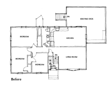In order to accommodate the enlarged and new rooms that the owners requested, we proposed additions to the south and east of the existing house. This meant that we’d need to rework most of the existing interior partitions in the original upper level. On the other hand, the changes wouldn’t interfere with the required zoning setbacks or the fully functional existing rear deck, and they would allow us to leave the less significant elevations largely undisturbed.