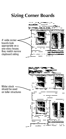 To achieve a pleasing sense of scale, corner boards should be sized with both the width of the siding and the overall height of the structure in mind. As with actual columns, increased height calls for added heft. The 4-inch corner boards that look just right on a single-story house sided with narrow clapboards may seem much too light and wimpy on an otherwise similar two-story house (see Figure 1).