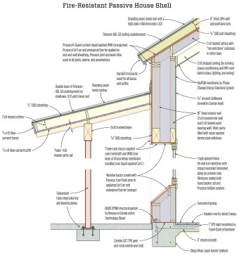 Keeping the building’s exterior noncombustible was relatively simple. The roof is metal; the exterior cladding is cement stucco. Trim is mostly Hardie fibercement. The few exposed wood trim elements are treated with fire-retardant sodium borate (also effective as a control for wood-destroying insects).