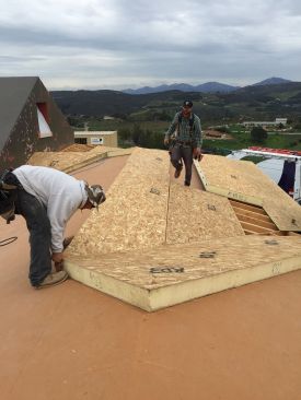 Passive House is a performance standard, not a prescriptive rule: buildings have to meet objective criteria for energy use, but how they achieve that goal is up to the discretion of the designers and builders. In the southern California climate, space conditioning requirements are relatively modest. Ramona has only about 2900 heating degree days, and about 1600 cooling degree days — but as Adams’ partner, Rich Williams, points out, summer heat is extreme, winter can bring frosts, and daily swings are large. To limit Casa Águila’s solar gain, Adams and Williams installed a reflective metal roof over a superinsulated roof deck (dense-blown cellulose capped with six-inch polyurethane structural insulated panels). Windows are triple-glazed Unilux tilt-and-turn units with high solar reflectance. Architect Andrew Wilt’s design called for shading to shelter the windows from the summer sun.
