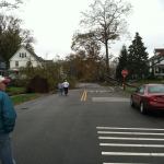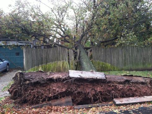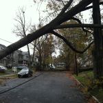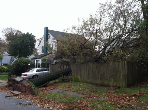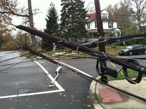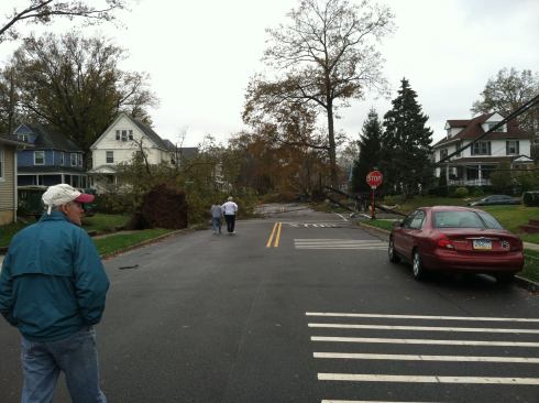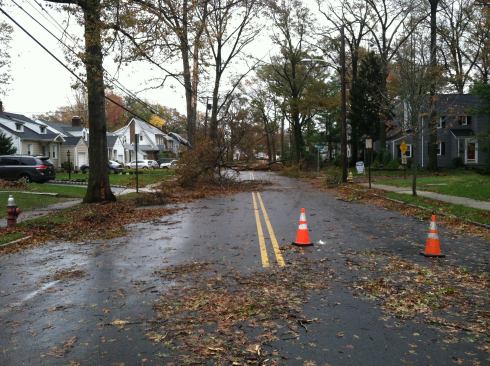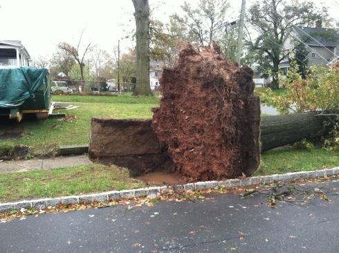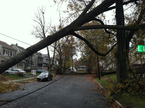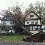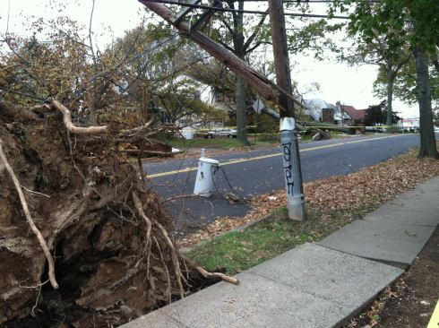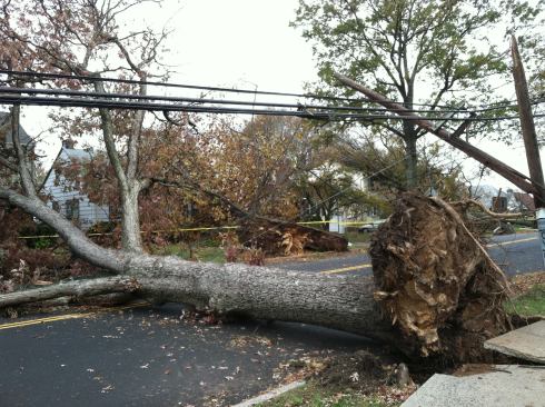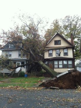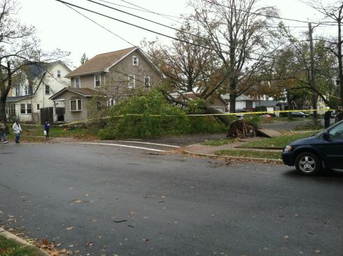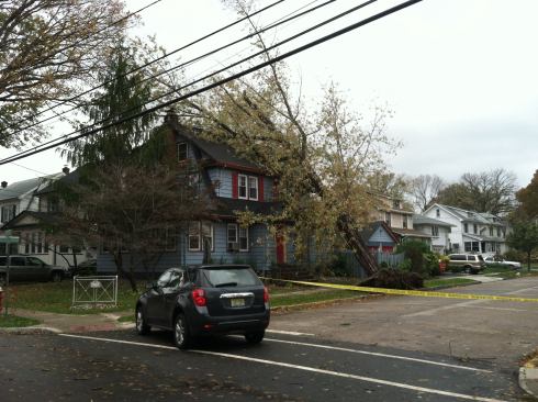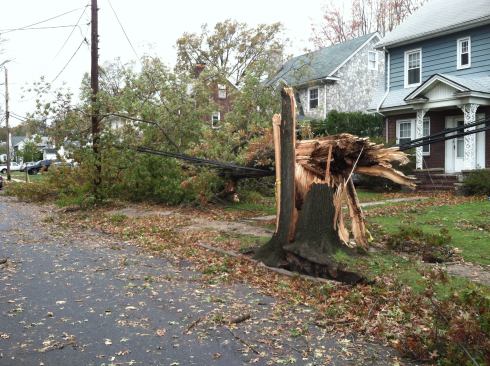 My hometown of Elizabeth, New Jersey is about 110 miles north of Atlantic City, where Tropical Storm Sandy made landfall on Monday evening. We only received a couple of inches of rain here, and are far enough away from major rivers and the shoreline that flooding was minimal; on the other hand, wind damage was extensive. During a recent walk through Elizabeth and neighboring Roselle Park and Union, I saw numerous trees – primarily oaks – which had been blown down onto power lines and houses (see slide show). On street after street, trees crashed into homes, power lines, transformers, street lights, and poles carrying communication lines. Many streets remain closed, and the ones that are open are a maze of dangerous electrical wires and precariously-hanging poles and tree limbs that drivers must navigate through.