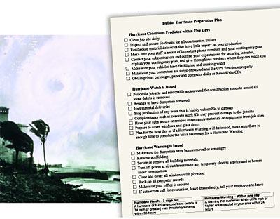 What’s the first thing you’d do when a hurricane warning sounds in the middle of a job? A ToolBase TechNote entitled “Hurricane Preparedness for Builders,” by the NAHB Research Center of Upper Marlboro, Md., offers a preparation plan (reprinted with permission at right), which itemizes tasks you might not have thought about beforehand.