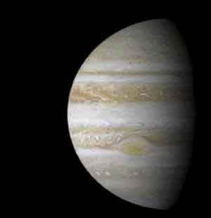 All that can be seen on Jupiter are clouds. Unlike Earth, where clouds consist of water vapor alone, Jupiter’s clouds are made of ammonia, hydrogen sulfide, and water. According to NASA observers, the brown and orange colors may be due to trace chemicals dredged up from deeper levels of the atmosphere, while the bluish bands are areas of reduced cloud cover where one can see deeper into the atmosphere. As clouds are sheared apart by the intense jet streams that run parallel to the planet’s equator, streaks form in the atmosphere. The prominent dark band in the northern half of the planet is Jupiter’s fastest jet stream, with eastward winds of about 300 mph.