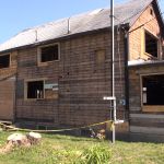 The original board sheathing remains in place, except where new window openings have been framed. The plan is to cover the exterior with Dow Styrofoam, taped at the seams, to form a new insulated air control layer and drainage plane.