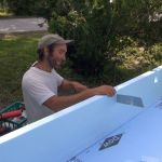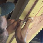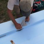 Kelly notches out the foam as he prepares to apply it to the top of the wall.