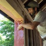 Kelly spreads out the FastFlash to form a continuous coat over the rough, irregular wood framing. Kelly chose the fluid-applied material for this part of the project because he was concerned that it would be difficult to achieve full adhesion on the rough surface using a construction tape.