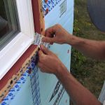 After sealing the Dow Styrofoam to the window buck with Dow Weathermate tape, Kelly ties the window into the drainage plane. Here, he applies a small patch of Siga Wigluv tape at the window buck corner.