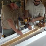 Jay Kelleher scribes a jamb extension. The original house walls were out of plumb, but the windows were placed plumb, so the carpenters have to split the difference as they trim the windows out.