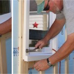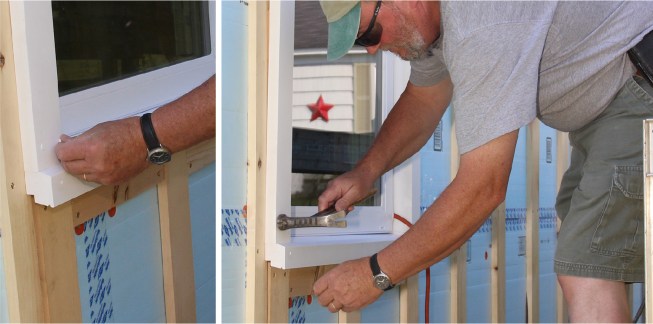 Using shims and screws, Kelleher and Martin fit their window trim pieces to the waterproofed opening and the strapped, insulated wall.