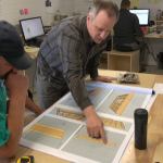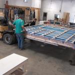 Shop manager Steve Greenleaf, owner Chris Corson, and designer Mike Maines roll a completed panel off the framing table onto the forks of a forklift. The framing table is now ready for the next panel, but Greenleaf still has to finish a few details on this piece of wall.