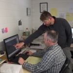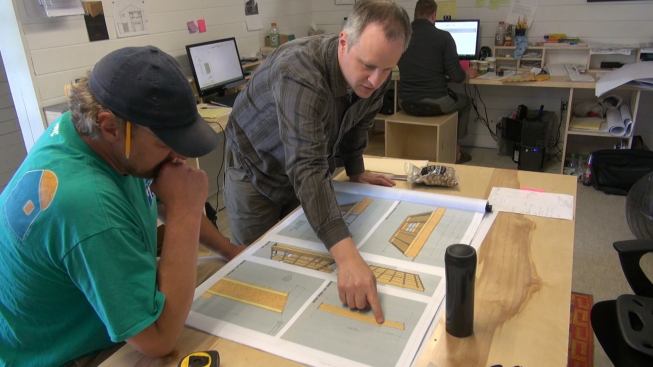 Owner Chris Corson and designer Mike Maines of EcoCor discuss a construction detail in the “Ivory Tower” office above Corson’s panelizing shop in Searsmont, Maine.