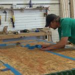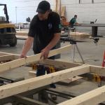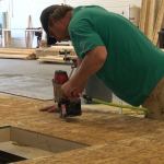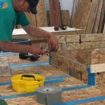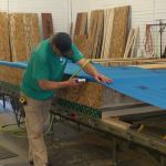 Steve Greenleaf nails OSB sheathing onto the exterior side of the interior stud frame of a Passive House wall panel. A shop table saw positioned near the wall assembly table is used to make precise sheathing cuts. Once seams are taped, the sheathing will serve as the air barrier for the house.