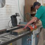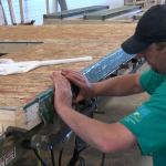 Steve Greenleaf cuts engineered rim board to length for a window buck, using EcoCor’s Northtech 18-inch up-cut cutoff saw. Equipped with a digitally controlled RazorGage positioning system, the Northtech saw is used for fast precision cutting of all the lumber components of the Passive House walls, including studs, wood I-joists, engineered headers, and strapping.