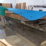 Steve Greenleaf applies ProClima Tescon Vana tape to the inside of the wall panel’s exterior window buck, integrating the weather-resistive barrier into the punched opening. The interior portion of the window buck will be detailed in the field before windows are installed. At this point, EcoCor does not build windows into wall panels before shipment because of shipping limitations.
