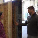Using a prototype, Chris Corson discusses the construction details and building science characteristics of his panelized wall system with architect Rachel Conly, visiting from Portland, Maine. Consisting of an OSB-sheathed 2×4 interior frame, then an insulation cavity formed by exterior-applied wood I-joists, the assembly is designed to be air-tight at the level of the OSB, but vapor-open to both the interior and exterior