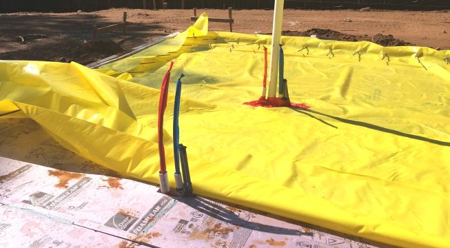 We taped the seams of this vapor barrier carefully and were also careful not to puncture it during construction. But making the sub-slab poly perfectly continuous isn’t highly critical. There’s no air pressure at this location to bring moisture through a pinhole leak, so a few punctures are not a big deal.