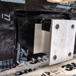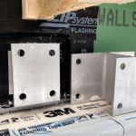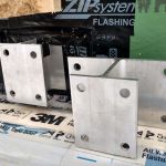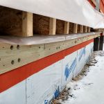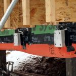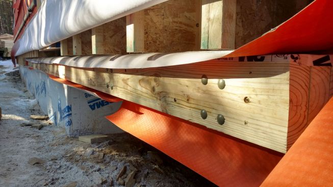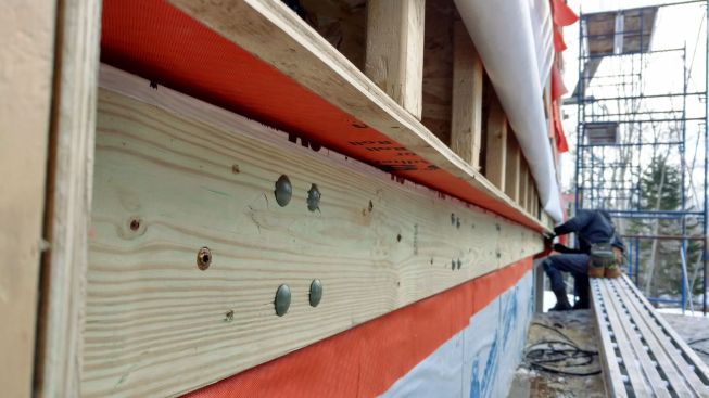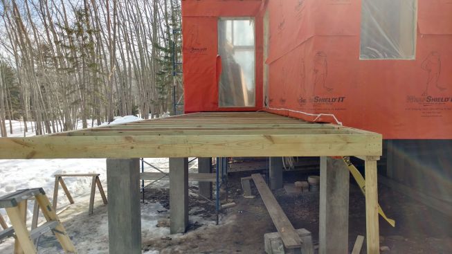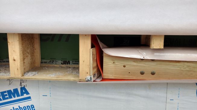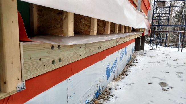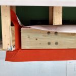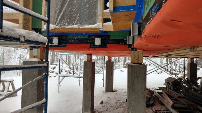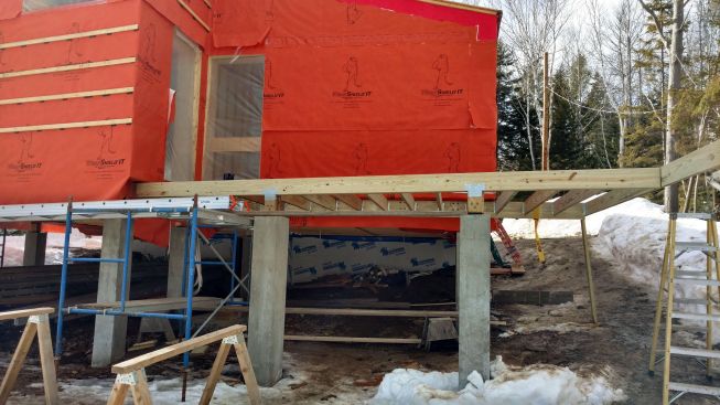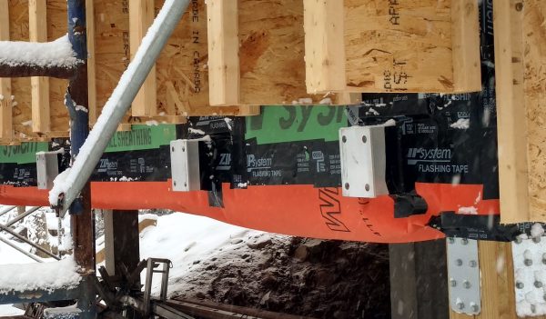 Designed by Portland architects Kaplan and Thompson, the house has posed a long list of technical challenges to the construction crew from building contractor Thompson Johnson Woodworks. Among the tricky situations is an outdoor wood deck, which will ultimately serve as a bridge from the main house to an accessory guest house a few feet away. Attaching the deck to the superinsulated house with a strong structural connection, while maintaining the home’s air control and vapor control layers, has been a complex puzzle for lead carpenter Mark Pollard and his crew. The solution was to mount the deck to the house with Maine Deck Bracket hardware, wrapping the VaproShield air barrier behind a triple 2×8 structural deck ledger outboard of the hangers and taping the membrane to the air barrier for the wall above the deck and the air barrier for the elevated floor system.
