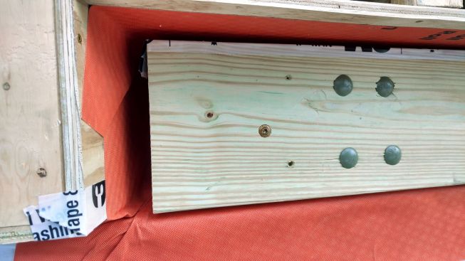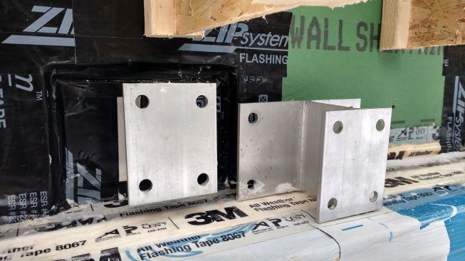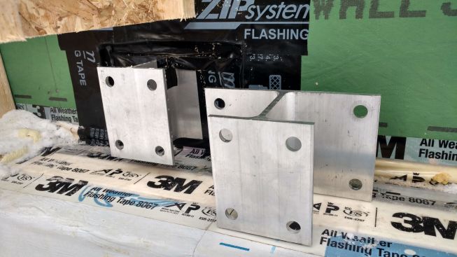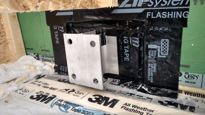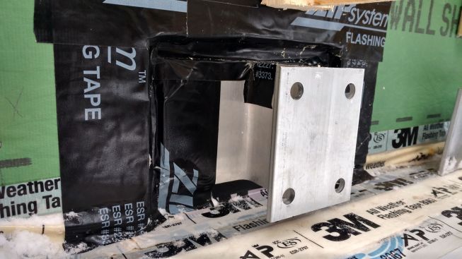 In the gap created by the hangers, the crew applied 3 inches of rigid foam insulation, drilling holes in the foam for the bracket mounting bolts and sealing any gaps with gun foam. The aluminum brackets still create a thermal bypass from the deck ledger to the LVL band joists where the brackets mount to the house, says Pollard—a compromise the team will have to live with.