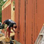 As part of my passion for building efficient homes, I push my clients to build “smaller.” Building an 800-square-foot home was a very good exercise for me in that regard. But limiting a passive house to that size increased the challenge. To get the high R-values in the walls, passive houses regularly have wall assemblies 18 inches deep or more. Walls that thick would have taken away more than 20% of the space inside the house. So to attain the proper wall thickness, we decided to cantilever the walls outside the perimeter of the foundation, which is exactly 800 square feet. I have read a number of articles describing I-joists being used to create thick walls for passive houses, but Baczek and I were concerned about installing I-joists vertically without them being fully supported on the wall plate. Baczek came up with the brilliant idea of designing a truss that could be fastened to the exterior wall. It could be used vertically and cantilevered—and still maintain full structural integrity. We built 14-inch-deep trusses with a corner notch at the heel, which was sized and oriented to sit perfectly on a 2-by ledger fastened to the sill plate at the base of the walls. The trusses were then lagged through the sheathing and into the 2×6 wall framing of the house.