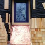 As a design element, the wall trusses cover only the lower 10 feet of the walls. We capped the trusses with a pitched shelf covered with copper flashing. Above the shelf, we wrapped the walls with 4 inches of rigid foam. Stepping the upper walls back from the outside makes the house seem less imposing and more cottage-like. Horizontal siding above the trusses also reduces the vertical scale of the house. We added a slight flair to the shingles at the bottom of the trusses to soften the cantilevered effect.