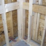 We framed the exterior walls first, completing and closing in the shell before building the interior walls. We used 2x4s at 16 inches on-center, with single studs at the corners since we only had to catch the plywood sheathing and not the drywall. Similarly, the interior walls only have to catch the drywall. Thus, the heat loss seen in typical wood-heavy corners is minimized but not eliminated (our thermal scans showed the corners somewhat colder than the general wall area, presumably because there’s still a greater concentration of studs there).
