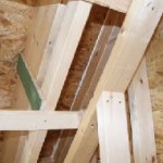 Our original roof framing detail called for standard 2x12s, cross-strapped with 2x3s set on edge on 16-inch centers. While this system would result in a nearly 14-inch deep insulation cavity with minimal thermal bridging, I was concerned that the 2x3s might twist, creating nail pops and an irregular ceiling surface. (I avoid using 2x12s whenever possible anyway, under the assumption that they come from old-growth trees better left standing.) Instead, we used 2×10 rafters and created a deep insulation cavity by nailing 14-inch-wide 1/2-inch-thick plywood gussets to 2x3s about every 3 feet, then nailed these assemblies to the sides of the rafters to create a new lower ceiling plane (Figure 7). The reduced contact between framing members — along with the 21/4- inch gap between the members — further minimizes thermal bridging. We opted for an unvented roof and installed solid blocking at the eaves between rafters, caulking all the edges for airtightness.