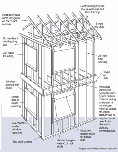 The release of a new draft specification for the EPA’s Energy Star 2011, guidelines for Energy Star qualified new homes program, has raised concerns among some energy raters and builders about whether advanced energy-efficient framing techniques required by the program are compatible with the beefy framing details needed to handle lateral pressures of wind in coastal regions. The new spec, slated to take effect in 2011, includes a new “Framing Checklist” that calls for two-stud corners, two-foot on-center stud spacing, single-member window and door headers, and framing reductions at window and door openings. The official comment period on the initial draft version ended this summer, and EPA officials are now working on a revised final version. Meanwhile, comments on the draft have been collected and are published on the EPA’s website. Michael Watt, Executive V.P. of the Long Island Builders Institute, made note of the potential structural conflicts in his comment, observing, “some Long Island [New York] municipalities will not allow items 2.1.1, 2.1.3, or 2.2 [two-stud corners, reduced framing around windows, and insulated sheathing]. The wind loads we are required to design to do not allow these practices.”