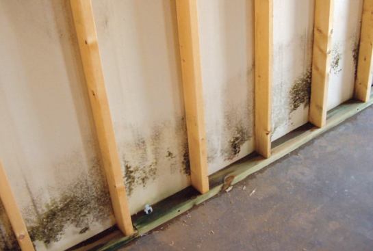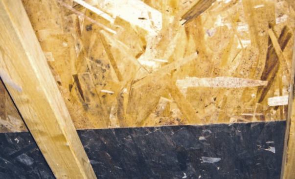 It is said that nature abhors a straight line, and in this case the shape of the dark patch was an important clue. What would make fungus grow in such a neat shape? The explanation was simple: It wasn’t mold at all. My friends at the wood products lab at the University of Minnesota readily identified the growth as sap-stain fungus, a common cosmetic blight on OSB, especially when the wood mix is rich in birch and poplar.