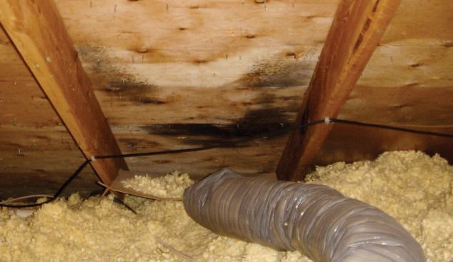 A plumber stuck his head up through an attic hatch and saw a disconnected flex duct — a bath exhaust pipe — lying in a bed of fiberglass insulation. Immediately downstream from the duct was a small patch of blackened roof sheathing. So he closed the hatch, climbed down the stepladder, and announced that there was a mold problem in the attic and that he wouldn’t do any work until the problem had been resolved.