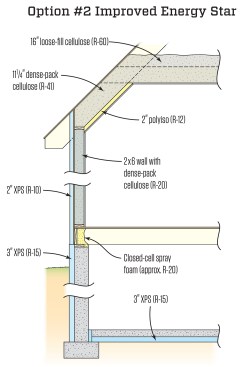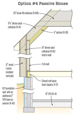 With regard to airtightness, Option #1 required the least effort and cost. For Option #2, reaching 2 ACH50 would be easily accomplished by taping the seams of the rigid-foam insulation layer. General air-sealing would be done in the attic prior to installing loose-fill cellulose. Options #3 and #4 required labor-intensive Passive House air-sealing techniques. Sticking to not more than four options will limit the amount of time you spend on estimating. Some homeowners will want to explore every option available, but for this process, four is more than enough. The final building assembly and price can be fine-tuned later.